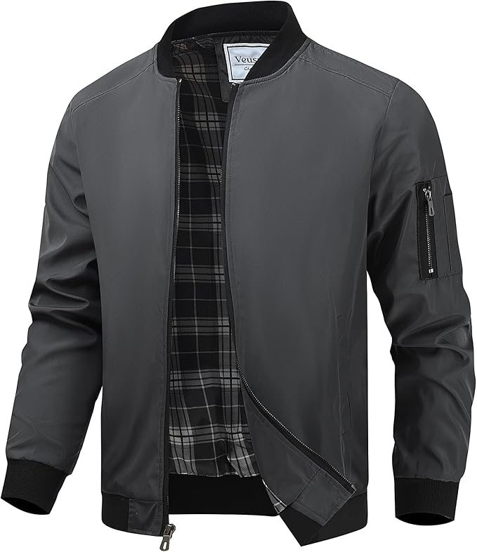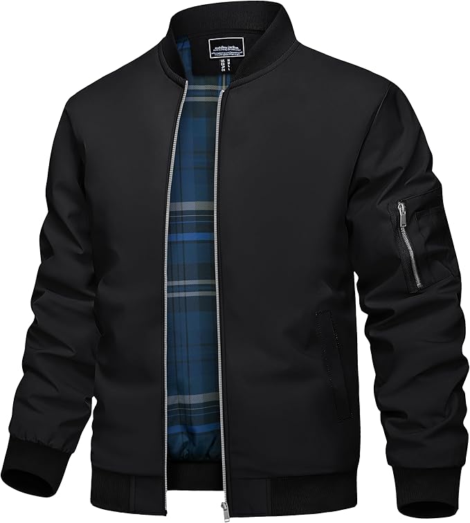 Men's Bomber Jacket Lightweight Windbreaker Plaid Lined Casual Fashion Spring Fall Windproof Zip Up Jacket for Men